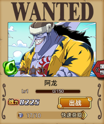 基本信息 名称:阿龙 等级:C级 生日:5月3日 恶魔果实or能力:锯齿鲨鱼人天赋 赏金:2000万贝利 角色羁绊