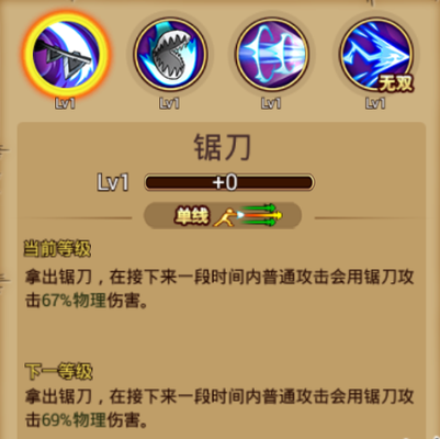 ①普通技能:锯刀 基本介绍:单线攻击,拿出锯刀,在限定时间内,可使用锯刀进行攻击,增加物理伤害。 使用心得:使用该技能时会出现向下拿到起锯刀的动作,当成武器来进行攻击,会持续一段时间;但使用其他技能,锯刀技能则结束。
