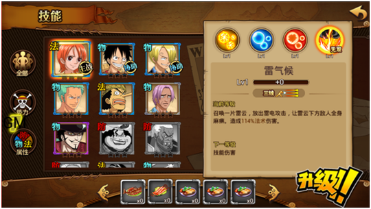 1、并肩的勇气:和路飞同时上阵时可以增加10%的法术抗性 2、以智取胜:和撒谎布同时上阵时可以增加10%的法术攻击 3、奈美的隐忍:装备法抗硬币S可以增加294法术抗性 4、奈美的坚强:装备生命硬币S可以增加488法术攻击 获取途径:商城卡包、首充赠送、竞技场积分兑换等。 属性类型:法攻型 技能介绍及使用心得: 普通攻击 普通攻击为棍法,共分为5段。每一段攻击完成后,都可以变向或者衔接其他技能。但最后一击会击退对手,因此除了靠边等特殊情况,普攻并不能够无限连。 技能介绍
