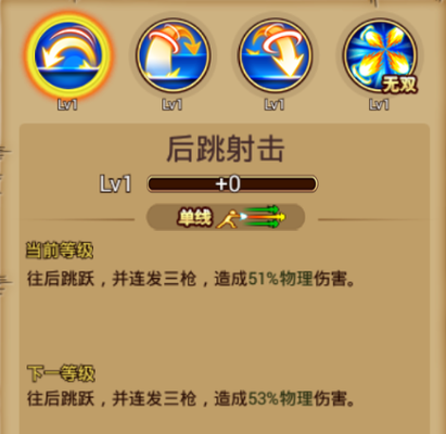 ①普通技能:后跳射击 技能介绍:单线攻击,往后跳跃,并连发三枪,造成部分物理伤害。 使用心得:该技能同为位移技能,虽只能单线位移,但跳跃跨度比另外2个普通技能大。