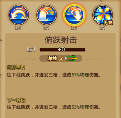 ③普通技能:俯跃射击 技能介绍:单线攻击,施放该技能,向下线跳跃并射击对前方敌人造成伤害 使用心得:该技能是一个非常好的跨线位移技能,能及时的躲避伤害,使用完该技能会跳跃到其他线路。