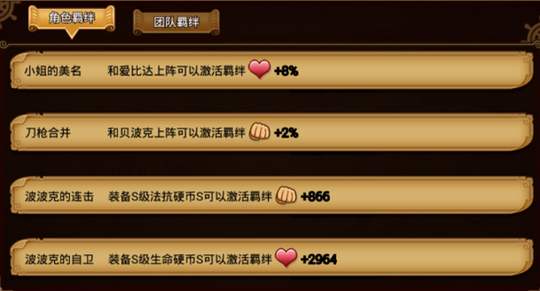 1、小姐的美名:和爱比达上阵可以增加8%的生命 2、刀枪合并:和贝波克上阵可以增加2%的物理攻击 3、波波克的连击:装备S级法抗硬币S可以增加866的物理攻击 4、波波克的自卫:装备S级生命硬币S可以增加2964的生命 角色获取途径:英雄副本掉落,商城卡包,成就任务奖励等。 属性类型:物攻型 技能介绍及使用心得: 普通攻击:攻击以6个动作为一轮,第六次动作为双手抱枪重击,攻速非常快。 技能介绍