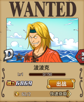 基本信息 名称:波波克 等级:D级 能力(恶魔果实):枪斗术 角色羁绊