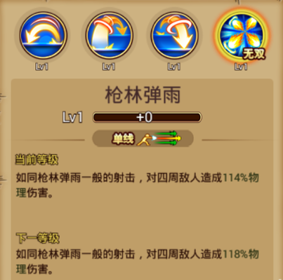 ④无双技能:枪林弹雨 技能介绍:单线攻击,如同枪林弹雨一般的射击,对四周敌人造成物理伤害。 使用心得:该技能也是位移技能,但是却有非常高的伤害。施放技能后,对前方三线敌人射击,造成强力伤害。 总结:该英雄输出非常挺高,而且还带有4个位移技能,是个非常好的风筝流。 [编辑:叶子猪小秘书]