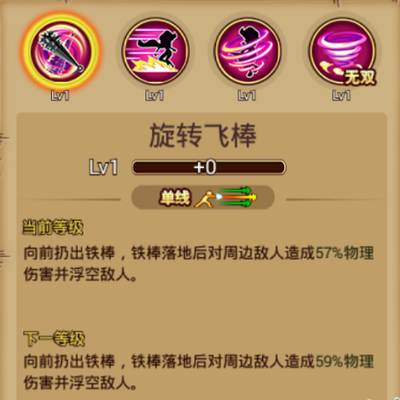 ①普通技能:旋转飞棒 基本介绍:单线范围,向前扔出铁棒,铁棒落地后对周围敌人造成部分物理伤害并浮空敌人。 使用心得:使用该技能时,爱比达向前扔出铁棒,铁棒抛物线向前飞行落地,对敌人造成伤害且浮空敌人,达到控制的作用。