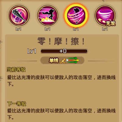 ①普通技能:零!摩!擦! 基本介绍:单线范围,光滑的皮肤可以是敌人的攻击落空,进而向下换线。 使用心得:使用该技能时,爱比达会旋转着进而换线下,从而躲避敌人的攻击;是一个强力的位移技能。但只能往向下线转移,在下线使用该技能是会原地不动的哦,这点需谨记喔!