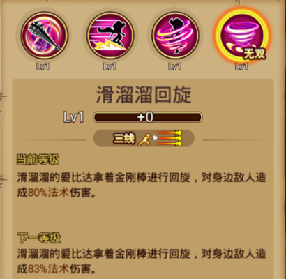 无双技能:滑溜溜回旋 基本介绍:三线范围,拿着金刚棒进行回旋,对身边敌人造成部分法术伤害。 使用心得:使用该技能时,爱比达会拿着金刚棒旋转着形成一个竖立锥形旋转攻击圈,对身边敌人造成伤害。 总结:滑溜人爱比达是一个拥有多项位移技能,利用好位移技能,组合搭配好各种技能连招,相信滑溜人爱比达是不错的英雄。 [编辑:叶子猪小秘书]