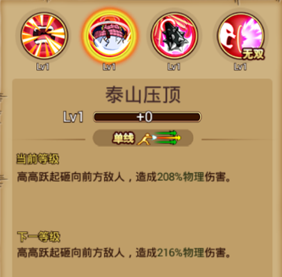 ②普通技能:泰山压顶 技能介绍:三线攻击,高高跃起砸向前方敌人,造成物理伤害。 使用心得: 使用该技能是出现一个高高跃起的动作,向前猛坐下,将圆圈范围内敌人砸飞,造成物理伤害。