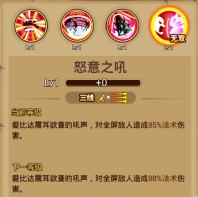 ④无双技能:怒意之吼 技能介绍:三线攻击,爱比达震耳欲聋的吼声,对全屏敌人造成法术伤害。 使用心得:向前方怒吼三下,造成法术攻击。 总结:爱比达是一个不错的防御型角色,拥有许多不错的控制技能,可进行搭配攻击,但攻击速度挺慢,被近身后普通攻击容易落空。 [编辑:叶子猪小秘书]