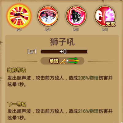 ①普通技能:狮子吼 技能介绍:单线攻击,发出超声波,攻击前方敌人,造成大量物理伤害,并眩晕1秒。 使用心得: 使用该技能会出现一个口喷光线的显示,攻击前方敌人;是一个不错的控制技能;可搭配其他技能进行使用,形成连招伤害。