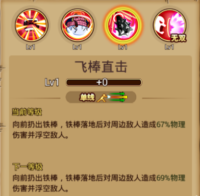 ③普通技能:飞棒直击 技能介绍:单线攻击,向前扔出铁棒,铁棒落地后对周边敌人造成物理伤害,并造成敌人浮空。 使用心得: 使用该技能是出现蓄力工作,然后向前扔出向前飞进旋转着的铁棒,造成物理伤害;是一个不错的控制技能,可结合普通攻击使用。
