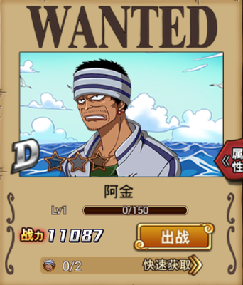 基本信息 名称:阿金 等级:D级 年龄:32岁 身高:160cm 能力(恶魔果实):格斗术 角色羁绊