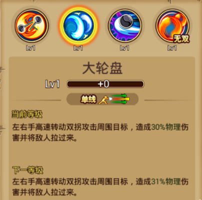 ②普通技能:大轮盘 技能介绍:单线范围,左右手告诉专用双拐攻击周围目标,造成部分物理伤害并将敌人拉过来。 使用心得:因攻击距离短,且攻击跨步也小,该技能能很好的增加优势,拉拢过来进行连招;可移动进行攻击敌人。