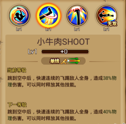 ②普通技能:小牛肉SHOOT 基本介绍:单线范围,跳到空中后,快速连续的飞踢敌人全身,造成多次物理伤害,在飞踢连击过程中可同时释放其他技能。 使用心得:该技能释放时,角色将起跳朝上空发起连续的踢击,仅能打击浮空敌人。在该技能释放期间可以试用其他技能衔接,可配合猛进·猪肉锅进行一套浮空追击。注意改技能打击范围小,命中较为困难,因尽量限制敌人的位移再进行打击。