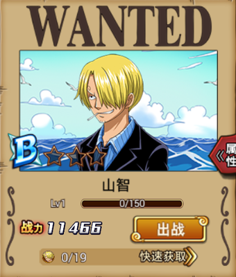 1、梦想之蓝:和路飞同时上阵时可以增加10%的物理防御 2、勇武与智慧:和佐罗同时上阵时可以增加10%的物理攻击 3、山智的原则:装备法抗硬币S时可以增加1109的物理攻击 4、山智的礼仪:装备生命硬币S可以增加124的物理防御 角色的获取途径:商城卡包、竞技场积分兑换。 属性类型:物攻型 技能介绍及使用心得: 普通攻击 普通攻击均为速度极快的腿法,总共分6段。每一段攻击完成后,都可以变向或者衔接其他技能,灵活性极高。1V1中可作为起手用。缺点是不能完美地无限连。 技能介绍