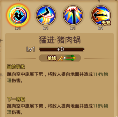 ①普通技能:猛进·猪肉锅 基本介绍:单线范围,跳向空中施展下劈,将敌人踢向地面并造成一定的物理伤害。 使用心得:使用该技能时山智会跳跃起来向下方进行踢击,攻击范围为前方一个身位,可以攻击地面及空中单位。该技能释放时拥有轻微的前摇,对技能的命中会产生很大的影响,此技能向下方踢击一次不提供浮空效果,所以适合用作连击技的收尾动作。