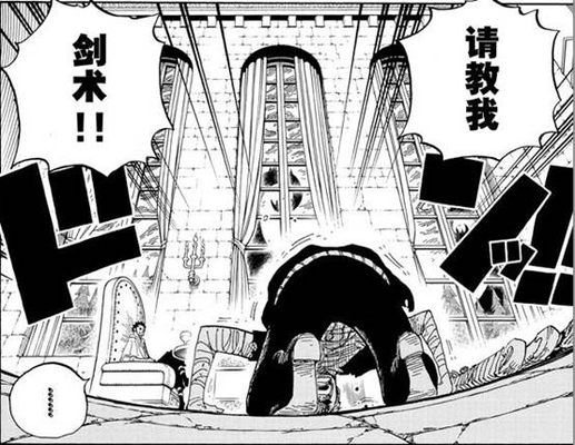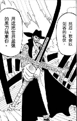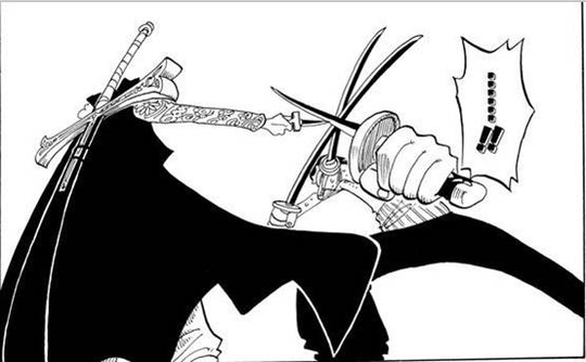 不得不说尾田这里非常用心,一个是“世界第一剑豪”,一个是令人闻风丧胆的剑客,如何表现他们力量上的差距?尾田用的手法是“不对等的较量”,看过的海迷都会有这么一种感觉“我都还没出力,你就倒下了?” 虽然最后鹰眼拔出了黑刀,迎战佐罗,不过这也不过是“剑客的礼仪”而已。