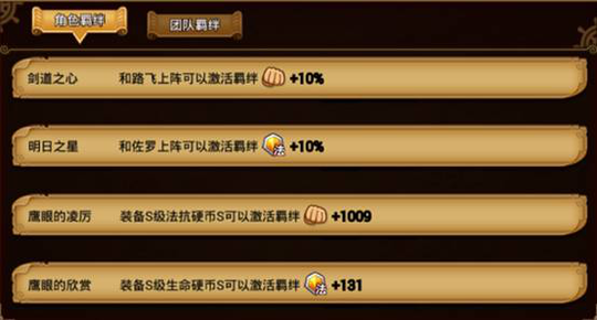 1、剑道之心:和路飞同时上阵时可以增加10%的物理攻击。 2、明日之星:和佐罗同时上阵时可以增加10%的法术防御。 这里的明日之星,指的就是佐罗。在大事件后,佐罗自知实力有限,便请鹰眼指导他剑术。2年后的佐罗有多强,就不用小编多说了。