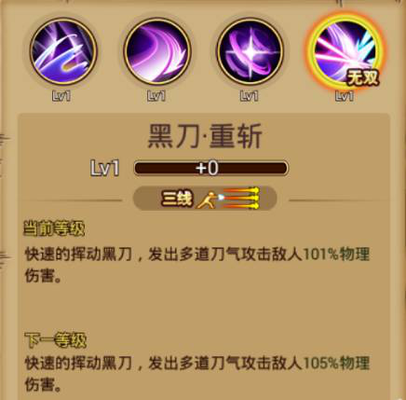 基本介绍:单线范围,释放刀气攻击身边敌人,造成大量的物理伤害。 无双技:黑刀·重斩