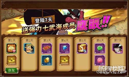 活动二:每日登录有好礼,登录即送鹰眼米霍克! 活动时间:公测抢鲜服开测期间 活动介绍:活动期间,每日登录游戏,即可获取丰厚奖励。连续登录2天,即可在新手活动界面-7天登录处获取草帽海贼团成员“大神撒谎布”;连续登录7天,更可获取七武海强力成员“鹰眼米霍克”。