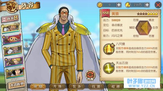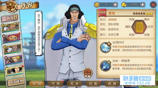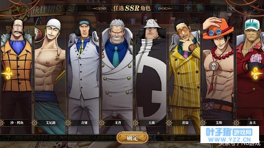 最后再给大家看下SSR的几个伙伴,这里给大家推荐一下,三大海军大将优先选择,黄猿,赤犬作为输出的核心位置,优先选择,如果都有的话在考虑青雉,艾尼路看大家自己的喜好,艾斯系统会送大家,所以三大海军大将是优选的!