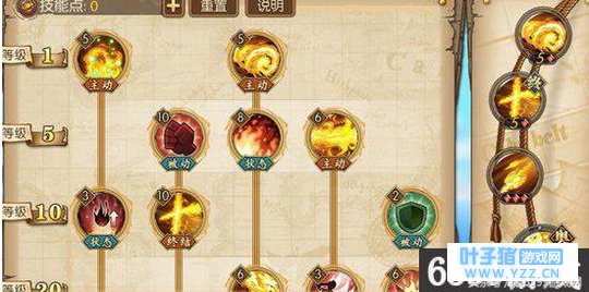 1级技能:主要加火拳,火拳可以攻击直线敌人,因此伤害比较广。而且火拳后续还会附加火属性伤害,伤害效果更加明显。火达摩只要点5点,开启后续技能就可以。 5级技能:攻击强化跟火属性伤害都要点满。这两个技能对艾斯伤害加成效果是最明显,特别是火属性伤害会直接加成到火拳上。镜火焰跟火达摩一样,也是点5点开启前置就好。 10级技能:十字火可以点满,攻击范围很大,算是范围输出技能。点燃只需要开启前置就好,防御强化就不要点,输出英雄不要浪费点数在防御上。