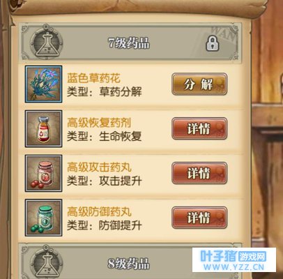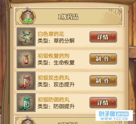 制药划分等级,1-3级别只能分解白色草药。分解之后得到一些药材,并获得制药经验。可以制造一些回血、短时间增益的效果。 而来到了4级,将会获得更大的收益。