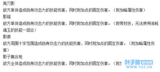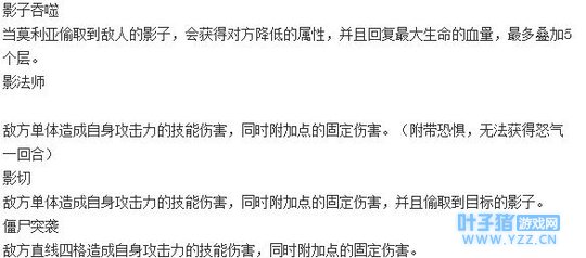 影子吞噬能够偷取敌人影子,降低对方的属性。其他的技能也是点单与直线伤害,附加的状态是恐惧,具体的魂玉消耗,小编这里暂时不清楚。