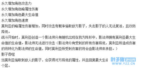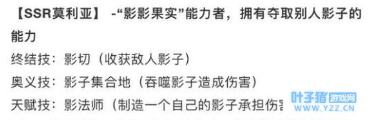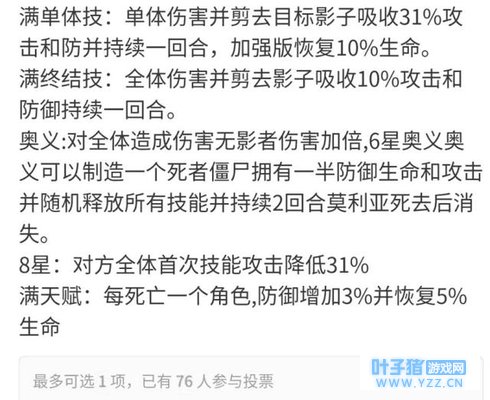 这个满单体技,对应的应该就是影子吞噬,偷取敌方的属性的。满终结技就不清楚了,毕竟是抢先服,也可能出现临时更改的。 奥义的话,这里比较具体,对于失去影子的单位,莫利亚造成的伤害翻倍。6星莫利亚还可以制造敌方单位死后的僵尸。
