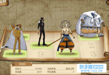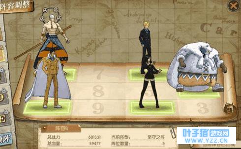 目前比较中庸的阵容,这个阵容主要利用赤犬与乔巴的扛伤与回血,只要赤犬不死,全村的希望就还在。输出方面,主要依靠黄猿与鹰眼。 阵容2 艾尼路、黄猿、山治、罗宾、瓦波尔战力:60万 战阵:坚守之阵