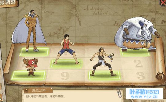 这一阵容的主要输出,依赖黄猿与乌索普,瓦波尔作为一名R卡,却有着令人咋舌的扛伤能力,也是这一阵容能够低战力通关的关键。同样配备了乔巴用以回血。 阵容4 路奇、黄猿、艾尼路、瓦波尔、乔巴战力:54万 战阵:激战之阵