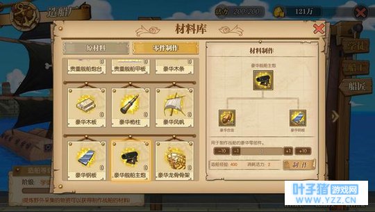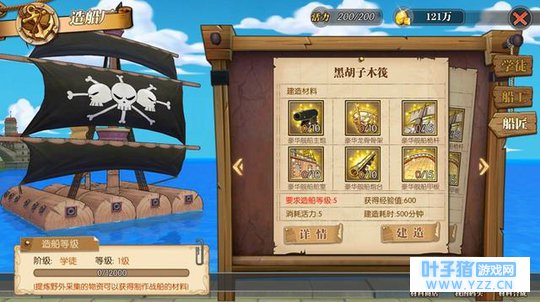 进入造船厂页面,能看到我们目前的船坞等级,以及对应等级可建造的一些船只,学习了新手教程系统会赠送一艘人气超高的黄金梅丽号哟!乔巴小可爱目前只是个1级的小透明,所以只能造黑色战士号。合成零件、建造船只能获得经验值,到了船工级别就可以建造可爱小鸭号,船匠级别可以建造黑胡子木筏等等。