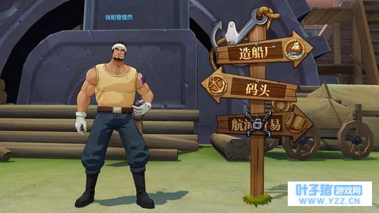 在游戏主页面点击【船坞】就能到达造船厂场景了,可以看到目前已经开放了造船厂和码头,航海贸易还不能体验喔。