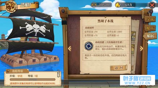每艘船的属性都不相同,下图中的黑胡子木筏,使用该船全员攻击、生命、防御、速度均可提升,海战中可发挥技能【交战双方所有治疗、恢复技能无效化,舰队速度增加】。