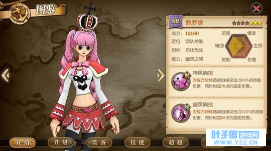 佩罗娜在游戏中是【团队控制】角色,优先攻击后排,范围、辅助、控制表现优秀。她的主动技、终结技基本是用各种幽灵花式打击对面。这个角色最大特点是各种方式降低对面的怒气和魂玉,【消极】【恐惧】这些状态能降低怒气,天赋技【消极消极】有概率减少魂玉,没了怒气和魂玉的对面就像鸟儿没有了翅膀,技能都放不出来还怎么当海贼王!