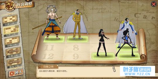 解析 :黄猿+青雉+艾尼路+罗宾,目前主流玩家比较容易凑齐的阵容,也是有机会扳倒8星鹰眼的阵容。原因很简单,双切后排+双高速+双控制。