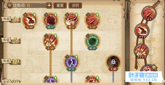 10级技能:破甲必须点满,可以给奥义技能增加破甲效果,输出更高。橡皮体质必须点满,让路飞可以减少受到伤害。 20级技能:破甲可以给橡皮长枪附带破甲效果,刚好可以跟前面的奥义技能破甲效果叠加。二档必须点满,前期用火箭炮,后期换上二档输出会高一些。 30级技能:绝缘体质必须点满,因为降低受到雷属性伤害可以专门克制雷属性的角色,比如艾尼路。橡皮巨人枪可以点满,强力单体输出技能。