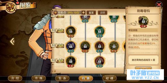 没错,就是被称为下水道扛把子的老沙。 他的天赋是这四个:剧毒弯钩(使敌方治疗效果降低)、暗杀统领(七武海阵营暴击加成)、沙沙果实(属性伤害提升)、沙尘气候(敌方命中率降低、闪避率降低)