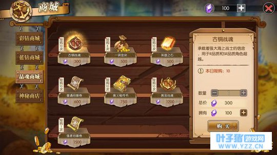 3、通过晶魂商城购买战魂升星 十抽之后多余的角色随便可以兑换晶魂,晶魂商城可以购买古铜战魂和黄金战魂,小编是把R,SR,SSR角色超越到满星后多余的碎片兑换晶魂的,虽然大概R角色和SR角色都升到满星估计也没什么卵用,但是为了满足一下小编的完美收藏欲望就都超越了,大家如果觉得没用可以不用超越直接兑换晶魂