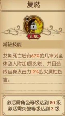 又是一个送死技,艾斯死后会对全体敌人增加1层灼烧效果,并且还将造成自身攻击力百分比的属性伤害。艾斯的速度普遍较低,所以经常第二回合前被秒杀,这里算是增加了艾斯死后的贡献,艾斯的爱好者稍微可以为艾斯松口气了。 卡普