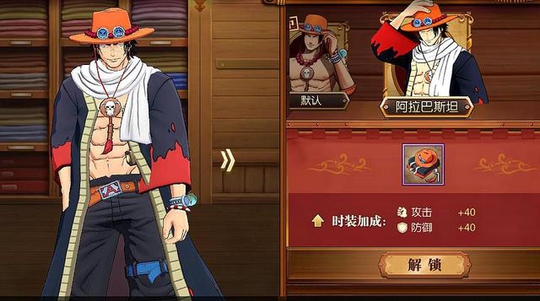 艾斯的时装是阿拉巴斯坦的那一套,也是动漫中,第一次正式登场。总得来说,这套时装还算可以,不过也只是可以。 乌索普