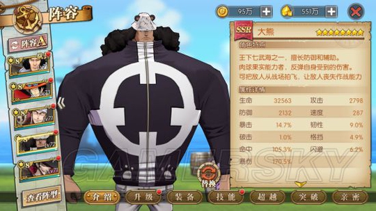 阵容位置如图,其实这关对于培养双坦的玩家来说比较简单,只需要前排抗住透明人后排抗住佩佩就好,我只有个八星熊,赤犬卡普只有5星,打了两天终于研究出一个单坦大熊的通关攻略。 我这套阵容大熊一速,大奶二速,其实一速大奶是最稳的,但是如果第二回合大奶吃了消极就要退出重来了,通关的前提条件有三: 一:大熊要关被动且不能被透明男秒,技能要带拍飞。 二:第二回合必须杀掉佩罗娜,楼主用艾斯是因为可以对前排造成大量伤害,鹰眼曙光必带,黄金套最好。 三:佩罗娜死后鬼医会当场把她复活并对后排造成致死伤害,所以我选择用艾尼路来吃技能,利用复活留在场上。 当满足了前提条件后,通关的概率就会大大上升。但还不稳,因为佩罗娜死后,透明男还会一直对大熊的位置造成大量伤害,而大奶的奶量难以支撑,所以我们要既要保证大熊不死,又要以最快的速度杀掉透明男,请注意:透明***媚惑的!!只要通过媚惑让他放不出技能,大熊就不会被秒,所以我的大奶技能带的是5+3+2,增加媚惑概率。接下来讲重点: 我知道一定会有杠精说熊带拍飞有什么用,佩罗娜不吃拍飞,但是非常有意思的一点是,佩罗娜不吃拍飞,透明男不吃拍飞,只有鬼医吃拍飞,又有杠精会说,大熊怎么可能打后排?因为透明男会隐身,隐身期间躲避普攻,所以大熊直接可以打到鬼医,所以在透明男隐身的时候,我们要赶紧把鬼医拍飞到前排,集中活力秒掉鬼医,最后通关(鬼医会在透明男死后的第四回合复活透明男,复活后伤害爆炸,所以必须先杀鬼医),楼下附楼主艾斯大熊属性图。 遗漏了一点,佩罗娜复活后的那一回合,必须再次杀掉佩罗娜。 第一回合,只放镜火焰叠灼烧,因为佩罗娜第二回合会放AOE身上瞬间叠满5层buff并对艾斯造成怒气。所以第二回合我们要用莹火加镜火焰接奥义(实测无怒气宝石可以奥义),然后从佩罗娜被复活后的那一回合。我们只放火拳就好 大熊带拍飞和3加2把所有的生命和防御宝石打上,不要吝啬,抗住才是王道。