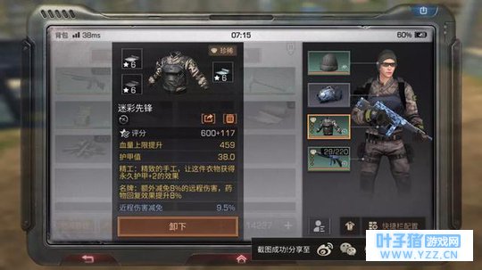 汤姆逊冲锋枪 这把雨战先锋皮肤的汤姆逊,还是比较极品的,攻击55,还有25.3%的暴击,更重要的是带2个特殊属性,迷彩永久加2个攻击,电光弹在击中敌人后可以持续标注一段时间敌人位置,可以说怼人的时候非常好用! 然后还加了3个6星的配件,评分也有515分,可以说是现阶段很合格的高端毕业枪了! 迷彩先锋 由于衣服消耗的少,差不多3把武器用完,衣服耐久才消耗1次,所以大家对衣服的关注不多,其实好的衣服也非常重要。 这件迷彩先锋评分700分,还是不错的。尤其是血量上限459很实用,要知道一个新人也才300多一点血量。 自带两个特殊属性,精工永久加2点护甲值,名牌减8%的远程伤害,还加药物回复8%,都是对生存有很大作用的技能,一个都没浪费。 配件也同样是3个6星的,可以看出,要想搞一套完整的毕业装备,如果肝度不够的同学,基本就只能考虑氪金了。