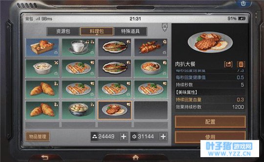 这两种食物都具备回血效果,其中肉扒大餐是长时间缓慢回血,蜜汁烤肉则是短时间快速回血,在没有绷带的情况下,蜜汁烤肉可以代替绷带使用。寒冷天气使得体温降低,血量也会逐渐下降,这时肉扒大餐的作用就体现出来了,每秒回复0.3血量,持续时间1200秒,也就是20分钟,别看这小点血量,加起来可有360滴血呢,关键时刻指不定能救你命~ 热水必带