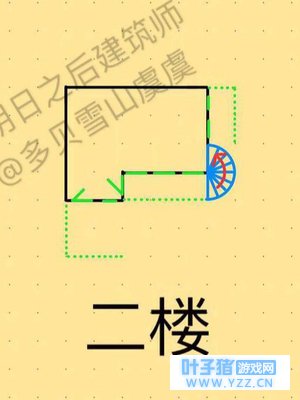 二楼:左侧小阳台2X2+1弧形地板,墙体4x2,右侧3x3,旋转楼梯与左侧门相对立。空出的墙沿用栅栏装饰。