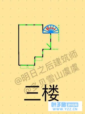 三楼:从左到右的空间占地分别为5x2、4x1、2x1(背后给旋转楼梯留一格位置,因此不是3x1),二三楼左上后面部分都为两面弧形墙,由于细节图比平面图晚出,所以有些后面的结构是看不到的!大家可自行调整!