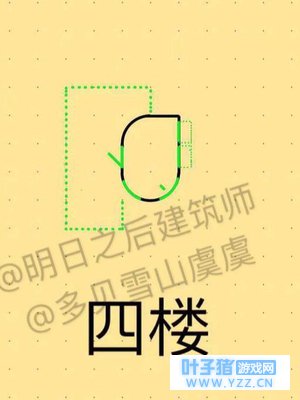 四楼:用到3面弧形墙和4面直面墙组合,不能全做4面弧形是!因为目前的弧形墙上还不可以装门,所以需要直面墙做调整。屋顶为4个弧形屋顶+2个1型屋顶。