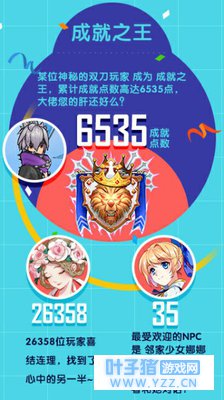 象征着“无限挑战”的天空之塔,也成为了玩家们实力与友情的见证 【6535点! 神秘成就之王登场】 就在这短短的15天中,“成就之王”也悄然诞生。玩家通过体验各种玩法能够累积成就点数,兑换超多奖励。而某一位神秘的双刀玩家则是将成就点数足足刷到了6535点,成为了万众敬仰的榜首。