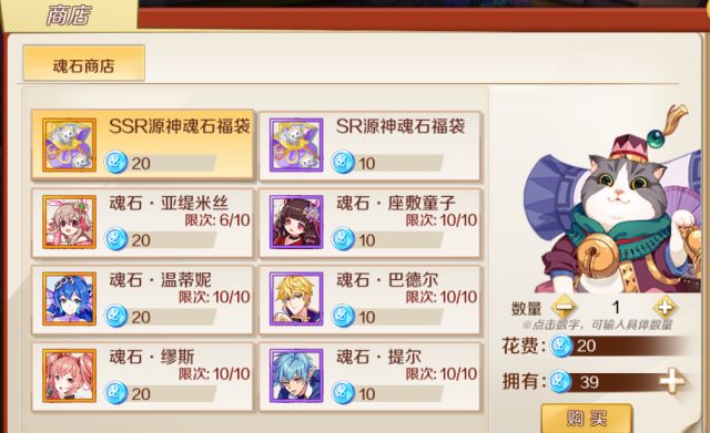 除了以上两个最容易培养的SSR源神外,还有两个较容易培养,后期可以考虑的SSR源神。 (没错,本人缪斯的图鉴没开!) 之所以本人推荐后期养这两个源神的原因是她们都有固定的碎片获取渠道: 魂石精元 兑换。 和魂石精元兑换里的随机SSR福袋相比,每天能固定兑换10个碎片的 温蒂尼、缪斯、亚缇米丝 无疑最适合玩家培养。