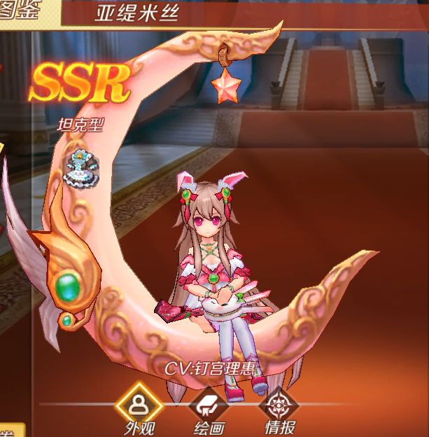 获取途径 :战场积分1000分,一天一片碎片;团商店随机刷新;真天塔、荣耀挑战、每日一充礼包里的SSR魂石袋。 亚缇米丝 作为玩家登陆就送的福利源神,配音钉宫理惠,样子也是萌萌哒,有嘲讽、提高主人属性和大招回血的能力,关键是萌!